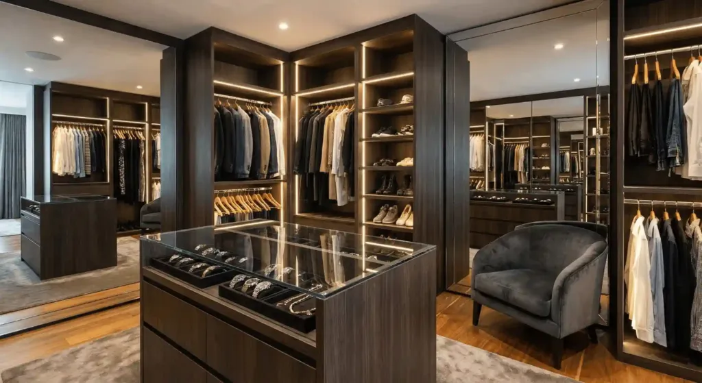 The “closet” is now a dressing room. Think of a boutique store. You need island storage for watches and jewelry. Use LED lighting inside every cabinet. This makes it easy to find clothes. I recommend velvet-lined drawers. Add a seating area. A small ottoman or armchair works well. Mirrors should be high quality. Avoid “funhouse” mirrors from cheap shops. Use Starphire glass for true color. This ensures your outfit looks the same outside as it did inside.