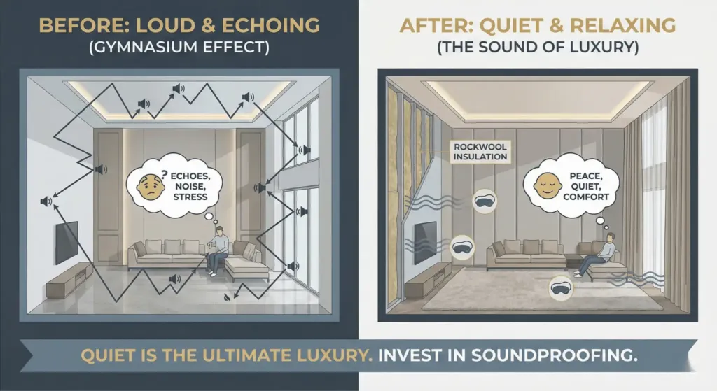 Nobody talks about how a luxury home sounds. If your house has high ceilings and hard floors, it will echo. This feels like a gymnasium. Use rugs and upholstered walls to soak up sound. I recommend Rockwool insulation in interior walls. This stops sound from traveling between rooms. You should not hear the dishwasher while you watch a movie. Quiet is a luxury. If your home is loud, it will never feel relaxing. This is a technical detail that makes a huge difference.