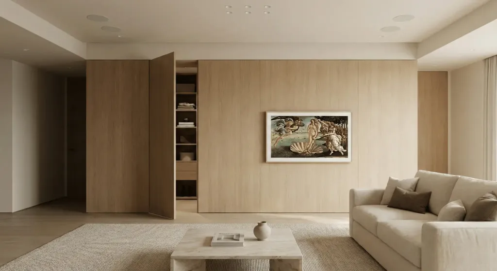 Clutter kills the luxury vibe. You need a place for everything. Use “hidden” storage in hallways. These are doors with no frames. They blend into the wall. I also suggest hiding your TV. Use a “Frame” TV that looks like art. Or use a motorized lift to hide it in a cabinet. You do not want a black plastic rectangle to be the focus of your room. Hide your speakers in the ceiling. Brands like Sonance make speakers that look like recessed lights. They are invisible.
