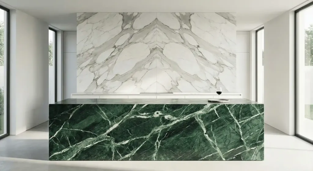 Granite is for entry-level homes. Luxury requires Calacatta Borghini or Arabescato marble. Do not use small tiles. Use full slabs with book-matched veining. This creates a mirrored effect. It looks like natural art. I saw a project where the designer used a single slab of green Tinos marble for a kitchen island. It was the only focal point. It was stunning. You must seal these stones. Marble is porous. Red wine will stain it. If you hate maintenance, try Taj Mahal Quartzite. It looks like marble but resists scratches. [Internal Link: Guide to Kitchen Stone Selection]