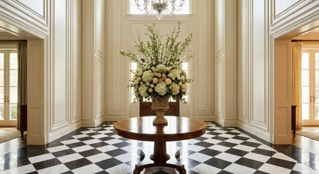 The foyer is the first impression. It must be grand. Avoid clutter here. Use a large round table in the center if space allows. Place a massive floral arrangement on it. I recommend herringbone wood floors or checkered marble. High ceilings are a plus. If your ceilings are low, use vertical wall molding. This draws the eye up. I once saw a foyer with a custom-painted mural. It felt like a museum. It told a story immediately. This is where you set the expectations for the rest of the home.