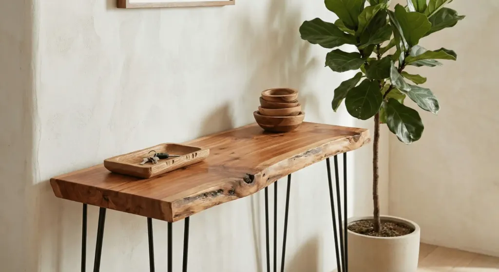 I found a local sawmill and bought a cedar slab for $40. I sanded it down and added “hairpin legs” from Amazon. It became a stunning entryway console. The imperfections in the wood provide a “found” quality that mass-produced furniture lacks. Look for stools, bowls, or small trays in natural oak or walnut.
