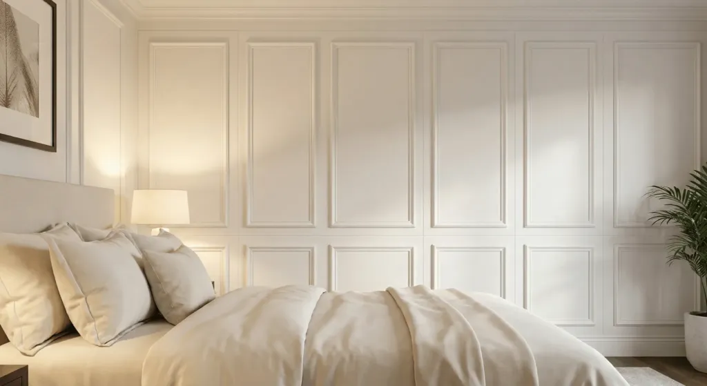 I used LuxeWall peel-and-stick trim kits. You measure, peel, and stick them to the wall. Once you paint over them, they look like permanent architectural features. I did my master bedroom for $120. The wall panels make the bed feel like it is in a luxury hotel suite. Avoid complex patterns. Simple rectangles are the most timeless.