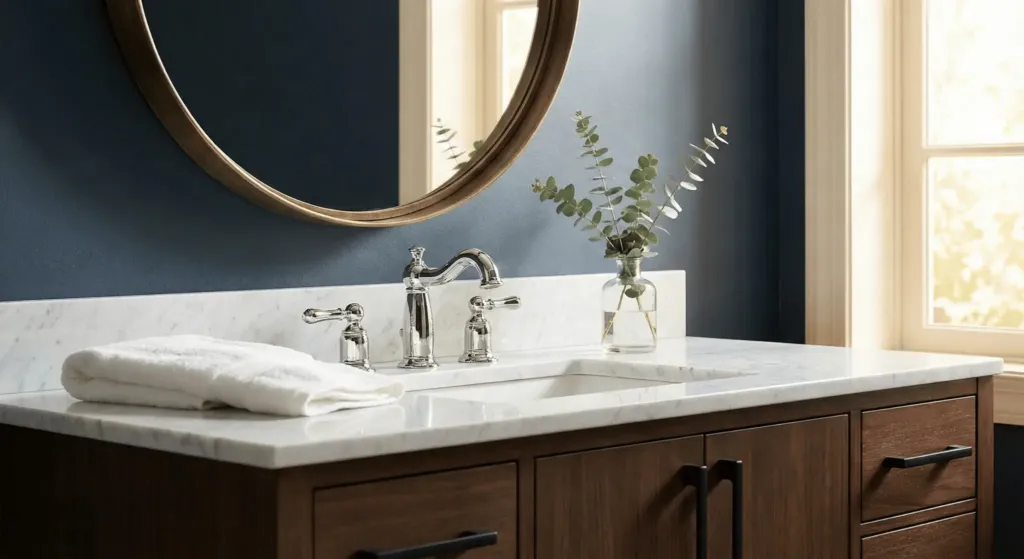 Use one dominant metal for 80% of the room and an accent metal for 20%. In my bathroom, I kept the chrome faucets but added a brass mirror and black cabinet pulls. This makes the space look curated over time rather than bought in a single trip. It allows you to keep existing fixtures while adding “expensive” accents.
