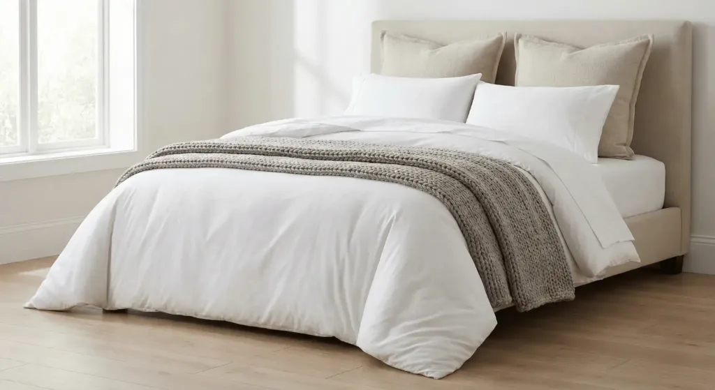 A flat bed looks sad. Luxury hotels use layers. I start with high-quality white cotton sheets from Quince. They offer luxury quality without the retail markup.