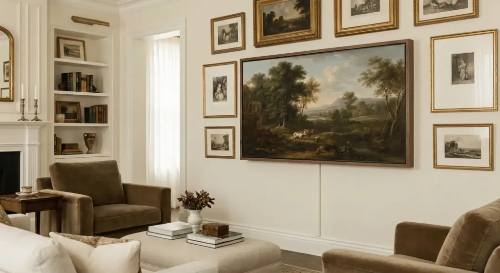 Search for “Vintage Art for TV” on YouTube. It will play a static image of a painting. Frame your TV with thin wood trim to make it look like part of the gallery wall. I also hide my cables using a $10 plastic cord cover painted the same color as the wall. Visible wires are the fastest way to kill a luxury look.