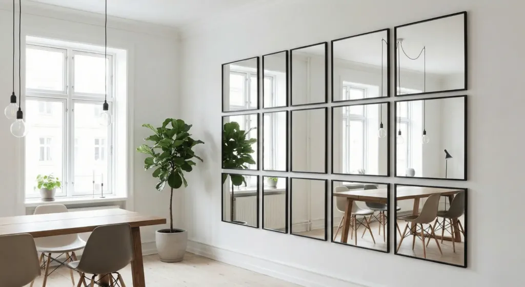 Mirrors are the oldest trick in the book for a reason. They make a space feel infinite. Instead of one small mirror, create a “window” using several framed mirrors.