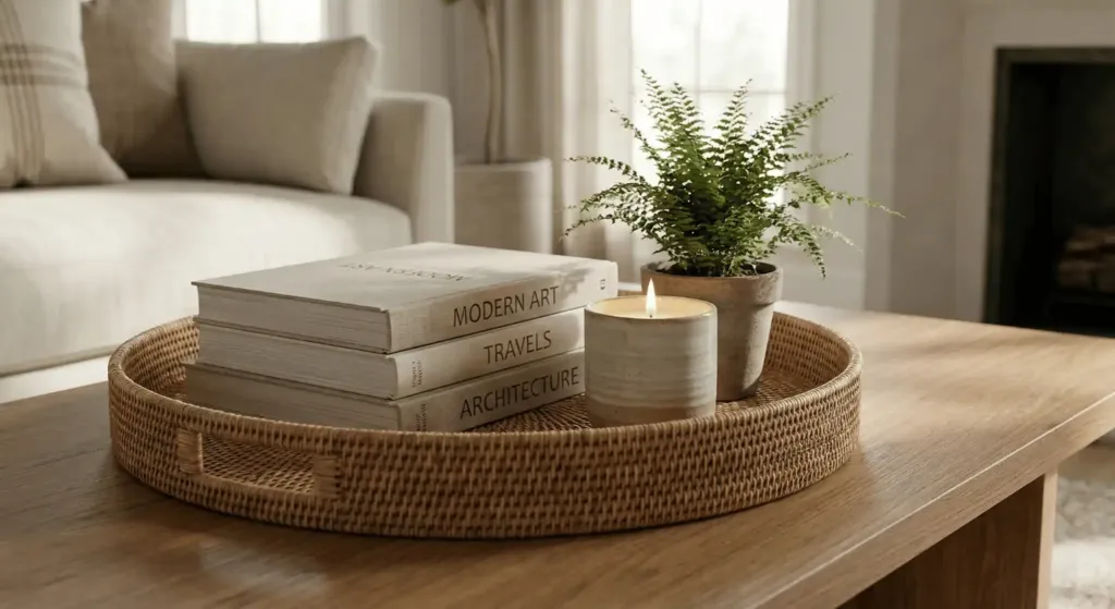 Place a tray on the table. Inside, place a stack of books (remove the colorful dust jackets for a neutral look), a candle, and something organic like a small plant. Vary the heights. I buy “Coffee Table Books” at thrift stores for $2 each. Look for books about art, travel, or architecture. They provide a high-end, intellectual feel to the room.