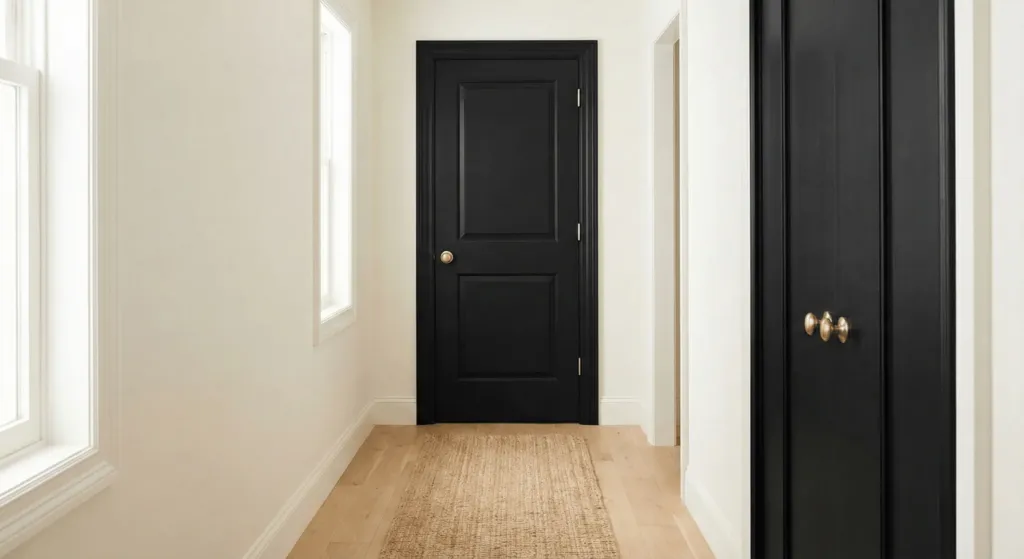 I painted my interior doors Tricorn Black by Sherwin-Williams in a satin finish. It made the cheap hollow-core doors look like solid ebony. It provides a focal point in a long, boring hallway. Use a high-quality brush to avoid streak marks. This project takes two hours and costs the price of a quart of paint.