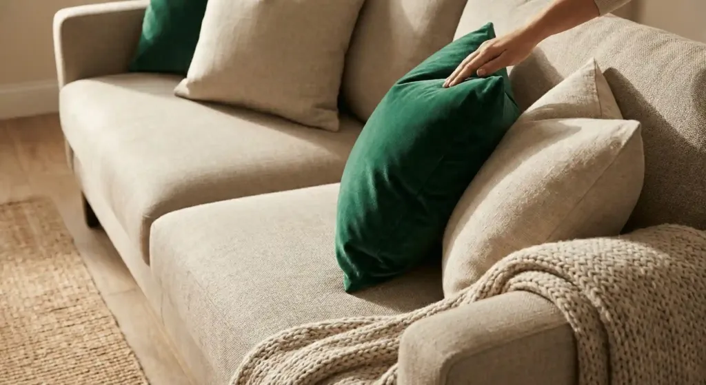 Your skin knows the difference between cheap polyester and real linen or wool. I source my pillow inserts from Amazon (look for duck down) and the covers from H&M Home. They have 100% linen covers for $15. A high-quality pillow makes a cheap sofa feel much more expensive because of the tactile experience.