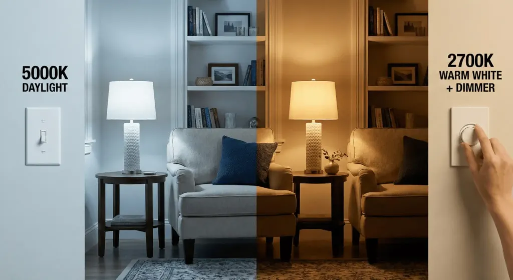 I replaced every bulb in my house with “Warm White” (2700K) LEDs. It creates a soft, golden glow that mimics candlelight. It makes skin tones look better and colors look richer. Put your lights on dimmer switches. Being able to lower the light in the evening is the ultimate luxury.