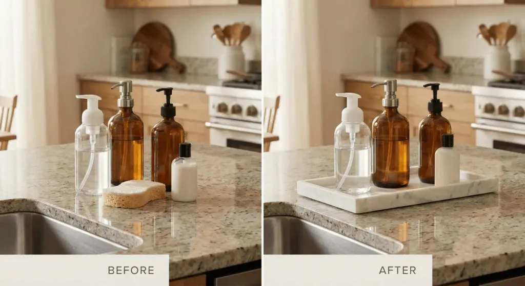 Place them on a small marble or wooden tray. Suddenly, they look like a “vignette.” I use this in my bathroom for perfumes and in my kitchen for oils and spices. It creates “boundaries” for your items. I find my best marble trays at Marshalls for under $20.
