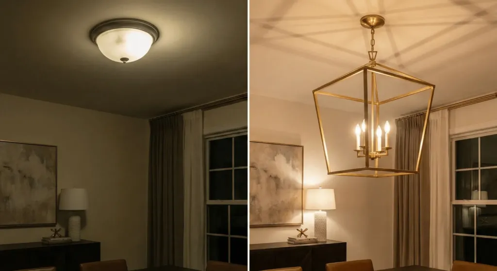 Standard dome lights are the enemy of luxury. They provide flat, unflattering light. I replaced every flush mount in my house with oversized pendants.