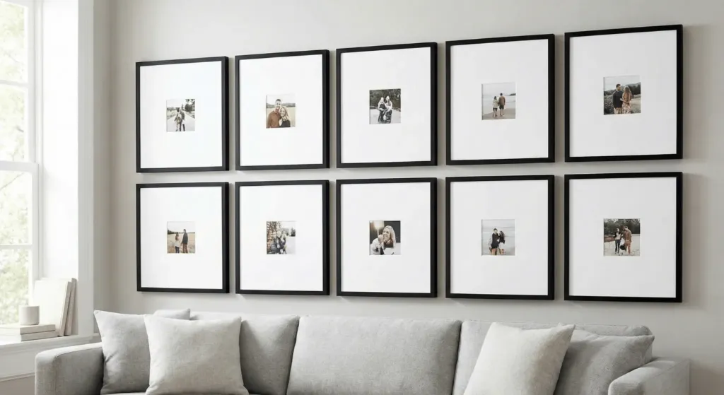 Empty walls feel cold, but cluttered walls feel cheap. The middle ground is the “Gallery Wall” with a twist. Use identical frames with very large white mats.