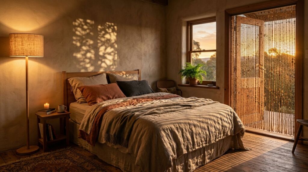 To truly capture the tree house feeling, you need to layer your lighting. Bamboo beads create incredible shadows when hit with side-lighting. Use a warm LED floor lamp placed at a 45-degree angle to the curtain. This creates a “filtered forest” effect on your walls.