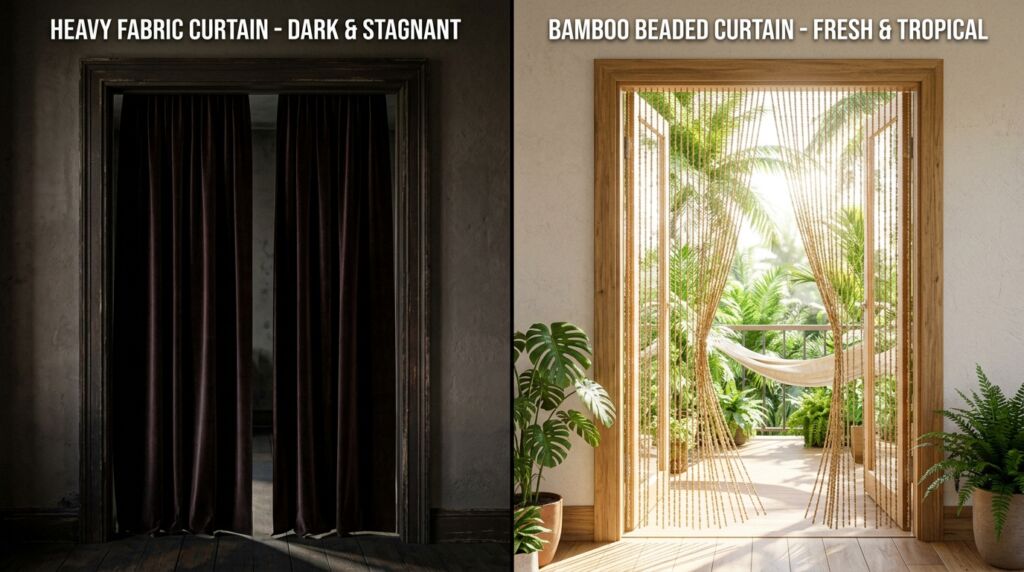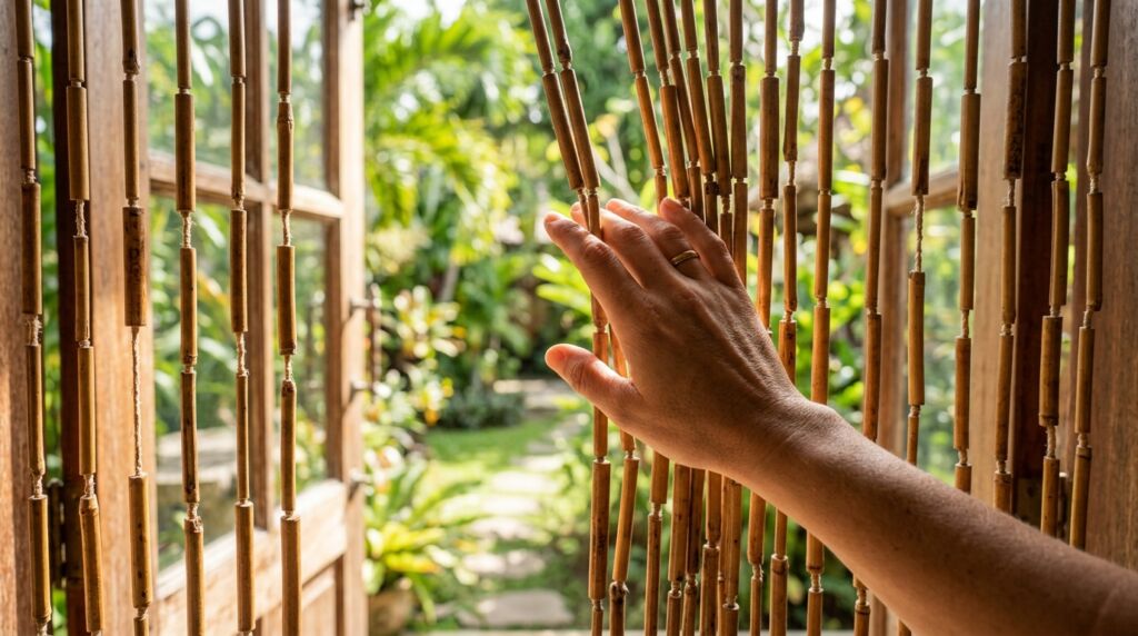 The resurgence of the beaded curtain isn’t about 1970s nostalgia. It is about the “Thailand Hostels” design language. Modern travelers want their homes to feel like an inviting home they found on a beach in Koh Samui. We crave nature indoors. Bamboo provides a sustainable, lightweight, and acoustically interesting way to define space without blocking light or airflow.