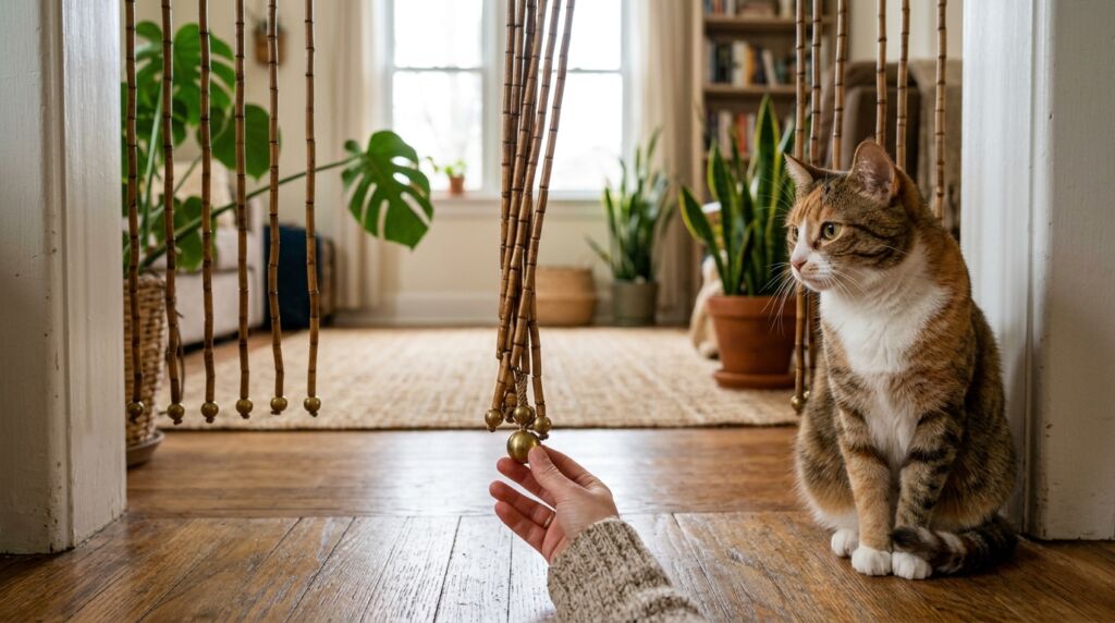 Bamboo beaded curtain hanging as a natural room divider in a bright living space.