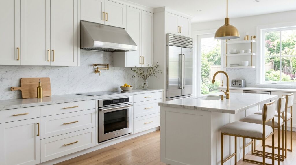 In a kitchen with brass, the two-metal limit keeps the design tight. I’ve seen people try to do chrome faucets, brass pulls, and black hinges. It looks like the builder forgot what they were doing. Keep your hinges hidden. Keep your metals limited to the big two. This ensures your mixing finishes in kitchen strategy feels like a choice and not an accident.