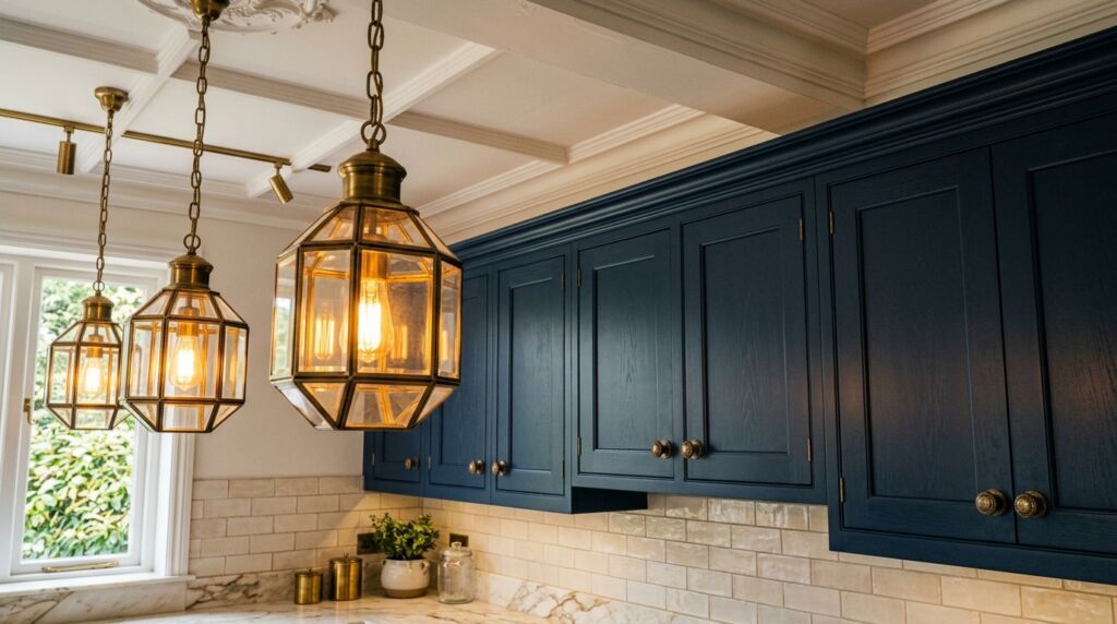 Your ceiling lights are the highest point of metal in the room. They should reflect both tones if possible. Look for fixtures that have a chrome frame with brass sockets. This is the ultimate “mixed metal hardware in kitchen” move.