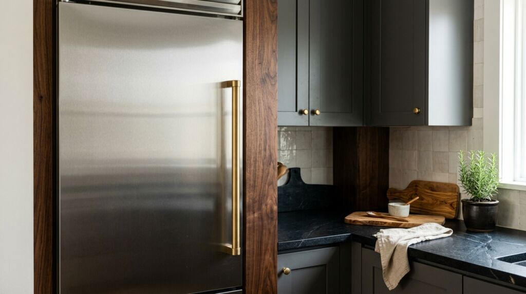 A stainless steel fridge is a massive block of cool gray. If you put a brass handle right next to it, the contrast is sharp. If you have a walnut wood panel or a black stone countertop in between, it softens the blow. It looks like a curated collection of materials. This is the difference between a DIY project and a professional kitchen with mixed hardware.