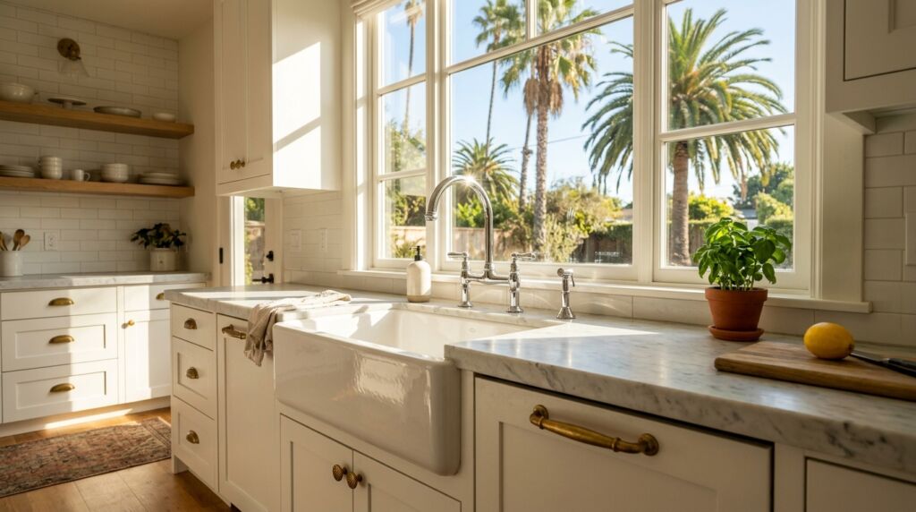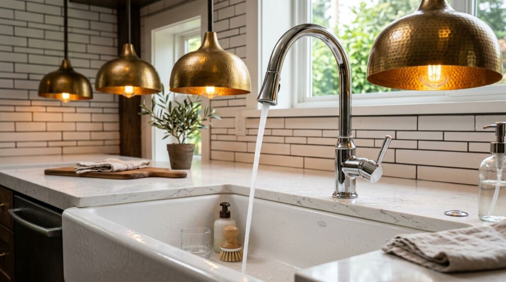 Your faucet is the most used tool in your home. It should not blend in. In a kitchen with brass accents, I often suggest a chrome faucet. Why? Because water spots on brass can look like dirt if the finish is not high quality. Chrome is a workhorse. It hides the daily wear of a busy family.