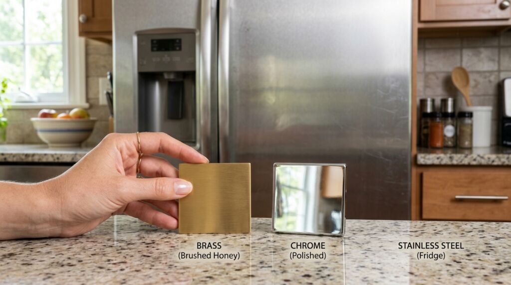 Look for a warm honey brass. It has a yellow base that vibrates well against the blue base of chrome. I keep a sample kit in my car with five different brass chips. Before we buy anything for a mixed metal hardware in kitchen project, we hold those chips against the fridge. If the brass looks muddy, we toss it. You want the brass to pop and not sink.