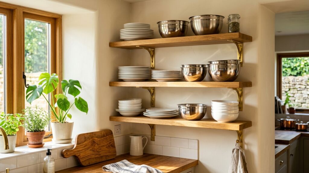 If you have open wood shelves, use brass brackets. This is a great way to introduce brass in kitchen corners that feel dark. The metal will catch the light and brighten the wood.