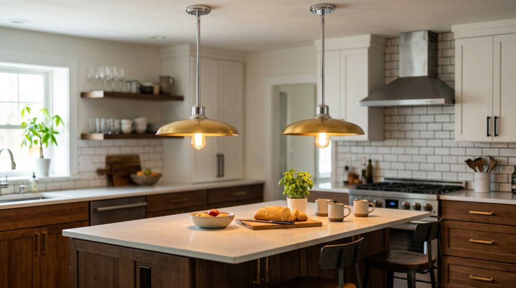 I recommend using brass for your pendant lights. This creates a golden canopy over your workspace. If you have a chrome and gold kitchen, the light fixtures are your bridge. They can even be mixed metal themselves. Brands like Rejuvenation now offer pendants that have both chrome stems and brass sockets. This is a cheat code for perfect blending.