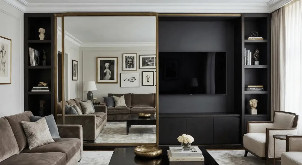 I prefer placing the TV on a dark wall. This helps it blend in. Another option is a gallery wall around the screen. This makes the TV look like part of the art collection. My own TV is hidden behind a large sliding mirror. When we want to watch a movie, we slide the mirror over. When we have guests, the room remains elegant.