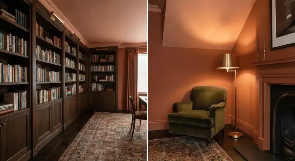This creates a “cocoon” effect. It feels intimate and expensive. In a library-style living room, a dark ceiling like navy can look stunning. I tried this in a small study last year. We used a soft terracotta. It made the room feel like a high-end hotel suite.