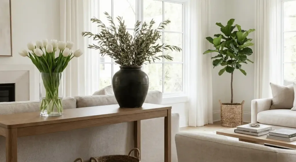 If you don’t have a green thumb, use dried branches. A tall vase with olive branches looks timeless. I buy fresh flowers every Friday. I don’t buy mixed bouquets. I buy ten stems of the same flower. Ten white tulips in a glass vase look more elegant than a cheap mixed arrangement. It costs ten dollars and lifts the whole room.