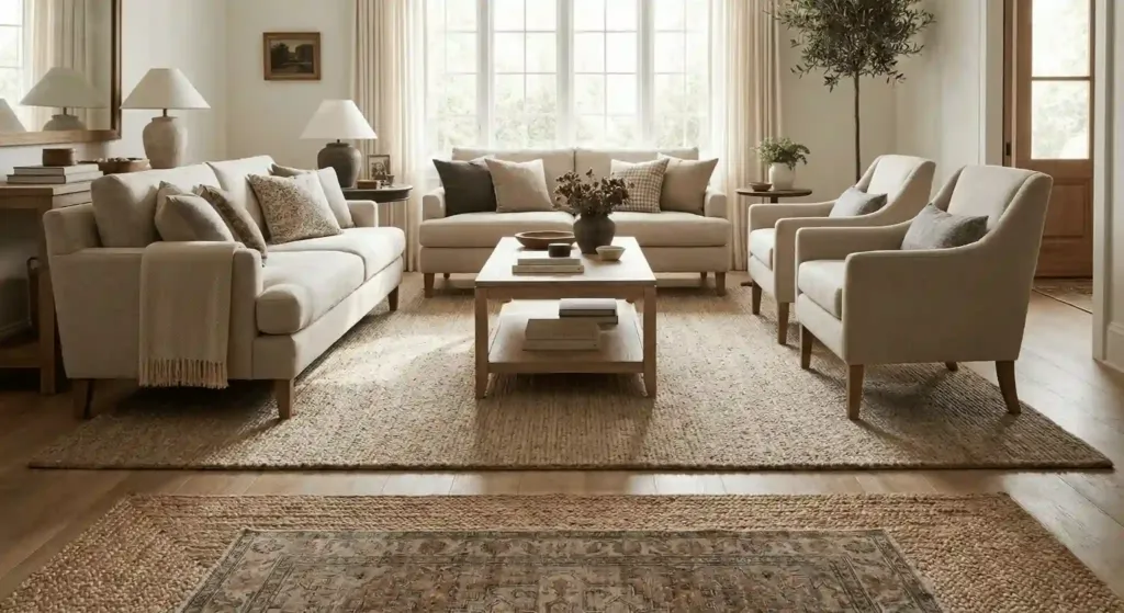 For an elegant look, choose wool or silk blends. Avoid shiny polyester. Wool lasts for decades. It cleans easily. I suggest an eight-by-ten or nine-by-twelve size for most living rooms. A good wool rug starts at eight hundred dollars. It is the foundation of the entire space. If you cannot afford a large wool rug, buy a cheap jute rug. Layer a smaller, nicer rug on top of it.