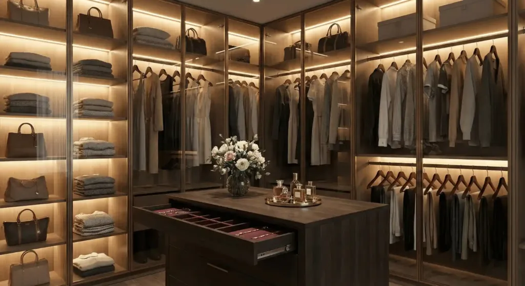 The transition from the bedroom to the closet should feel like a luxury store. Use glass-front cabinets and integrated LED lighting on every shelf.