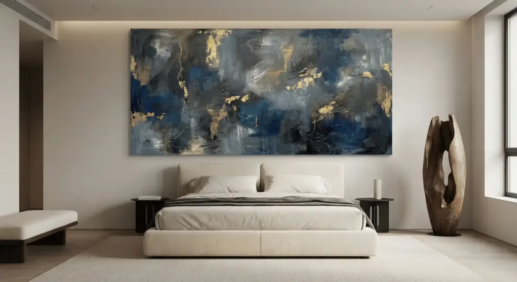 Small frames look cluttered. In a luxury bedroom, go big. One large canvas over the bed or a tall sculpture in the corner creates a gallery feel.