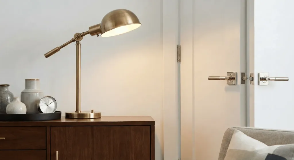 I use brass for the lamps and nickel for the door hardware. This prevents the room from looking like a set from a big-box store.