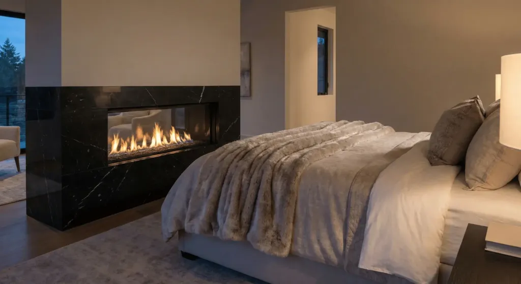 The glow of a fire at the foot of the bed creates a cozy, high-end atmosphere. Frame it in a dark stone like soapstone or Nero Marquina marble.