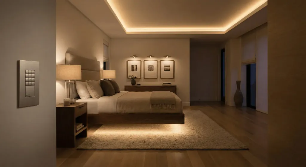 Architectural lighting is hidden. Think of LED strips in the ceiling coves. Use them under the bed frame to create a floating effect. This avoids the harsh glare of a bulb.
