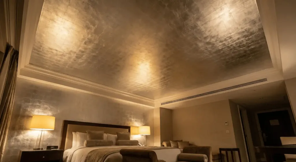 The ceiling is the most ignored space in a room. In a luxury suite, we call it the fifth wall. Plain white paint is too simple. Use wallpaper, wood beams, or plaster finishes.