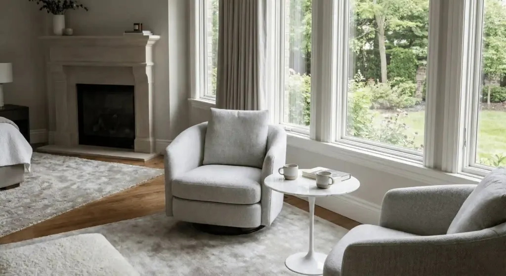 In a large master suite, this fills the “dead space” near windows. Use a swivel chair so you can look at the view or the fireplace. I prefer chairs from Minotti for their sleek profiles.