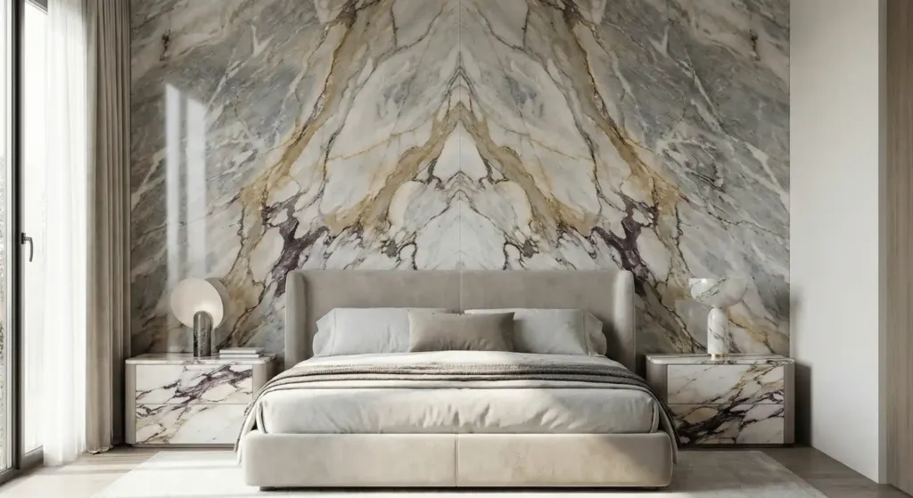 Marble is not just for bathrooms. A book-matched marble wall behind a bed is a bold statement. It brings an organic, heavy feel to the room.