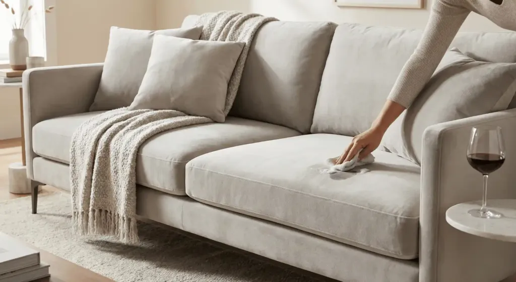 I once spilled red wine on my light gray velvet sofa. I panicked. I used a damp cloth and some dish soap. The stain came right out. This is why I always recommend performance fabrics for families. Brands like Joybird and Burrow offer great options. A good sofa will cost 1,500 to 3,000 dollars. [External Link: Architectural Digest Guide to Performance Fabrics].