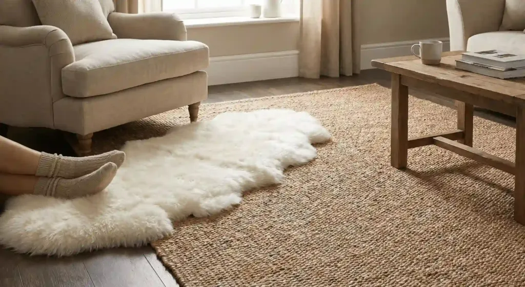 I put a white sheepskin from IKEA over my jute rug. It cost 40 dollars. It adds a layer of softness where I put my feet. It also makes the room look more “layered.” Designers do this to make a space feel lived-in. It stops the room from looking like a furniture showroom.