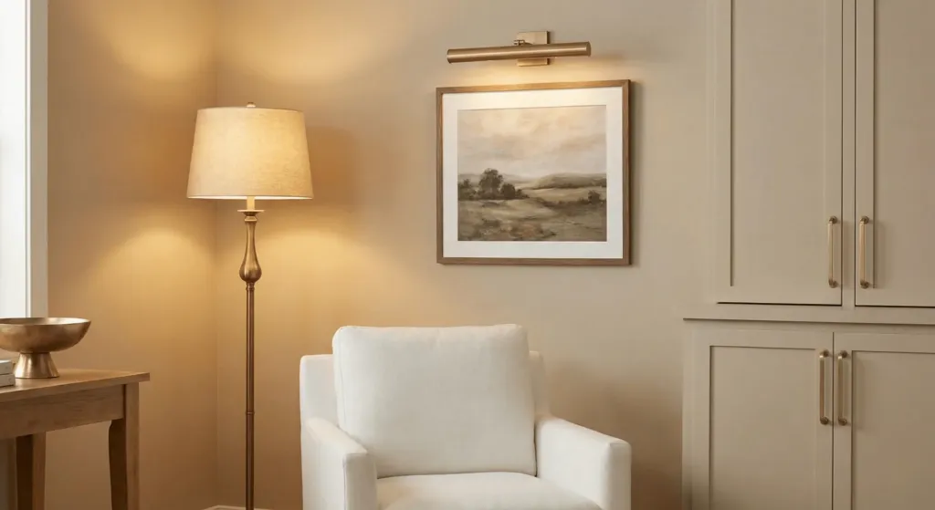 I changed my floor lamp to a brass one from Target. It cost 80 dollars. The gold tone glows when the light is on. It acts like jewelry for the room. You can also add brass picture lights above your art. This makes the art look like it belongs in a museum.