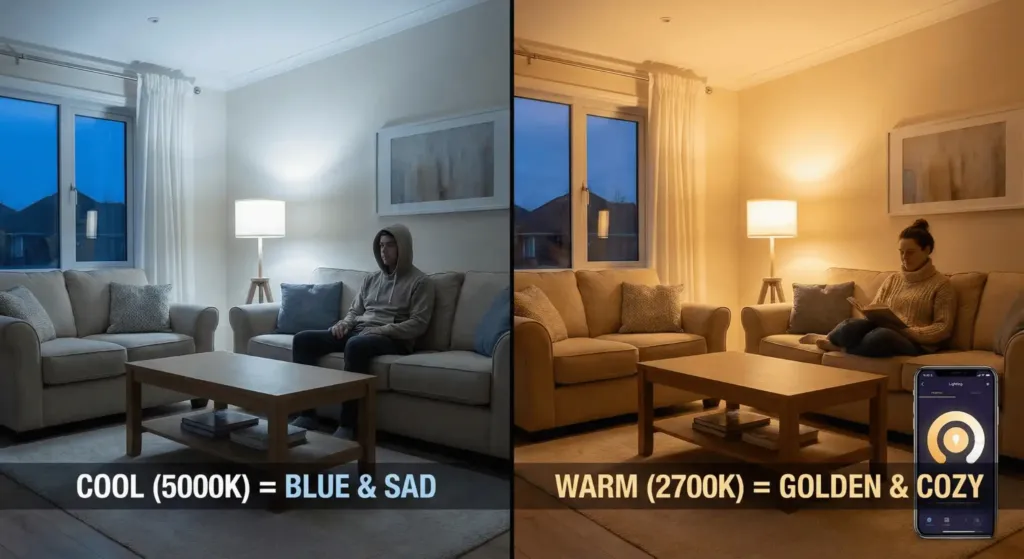 Lighting is the most overlooked part of design. Cool bulbs (5000K) make neutral rooms look blue and sad. Warm bulbs (2700K) make them look golden and cozy.