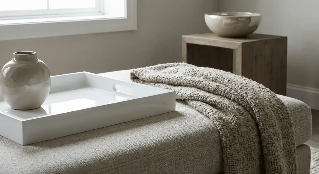 I have a lacquered white tray on my ottoman. It reflects the light from the window. Next to it, I have a rough wool throw blanket. That contrast is what makes a room feel “professional.” It is a free way to upgrade your styling. Just look around your house and swap items.