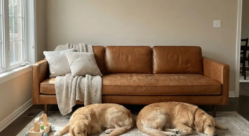 Leather acts as a neutral but brings a rich texture. Cognac or camel colors break up a beige room without adding “color.” It wears well over time and handles spills better than fabric.