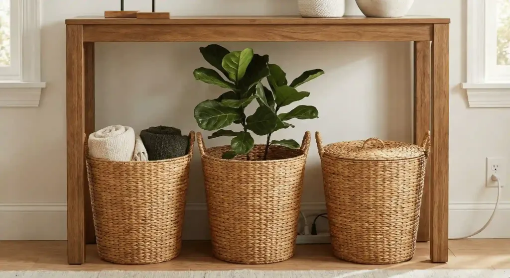 I buy sea-grass baskets from World Market. They are about 30 dollars. I tuck them under my console table. They hide the messy wires and add a natural texture. Baskets are a “triple threat.” They are cheap, look good, and help you clean up.