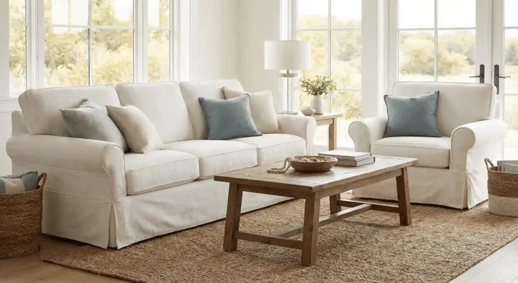 I have a slipcovered chair from IKEA (the Ektorp/Uppland). I have washed the cover ten times. It still looks new. It makes the room feel less formal. People feel like they can actually sit down and relax. A high-end version would be the Sixpenny sofas, which cost about 4,000 dollars.