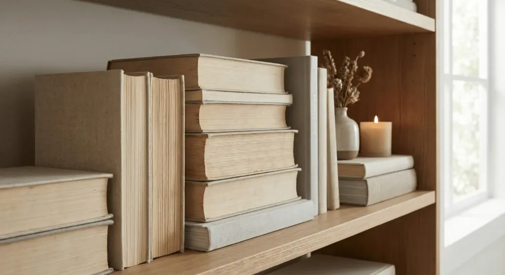 I did this on my main bookshelf. I didn’t buy new books. I just flipped the ones I had. It took 10 minutes and cost zero dollars. It instantly calmed the room down. If you want a more “pro” look, buy vintage linen-bound books from eBay. You can buy them “by the foot” for about 20 dollars.