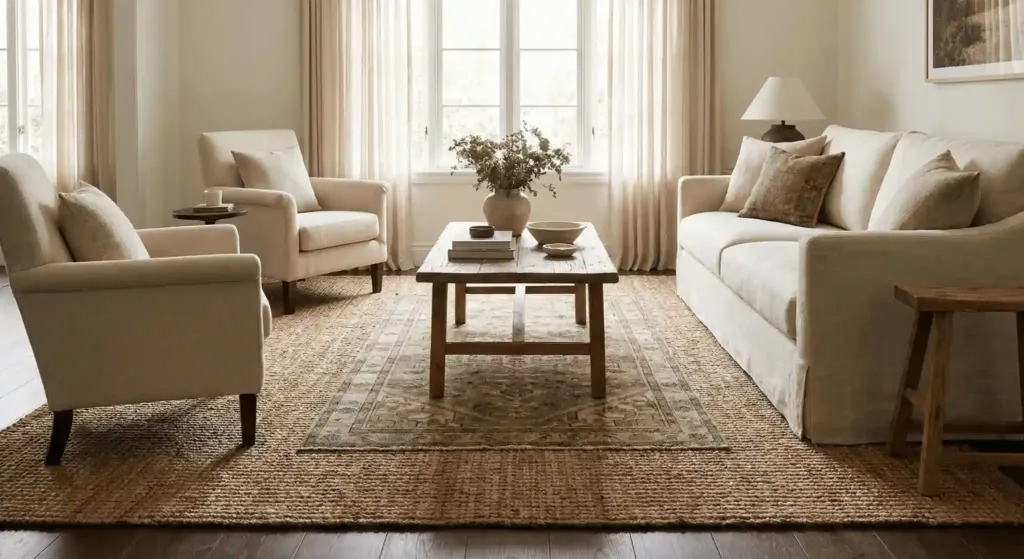 Natural fiber rugs provide the best foundation for neutral designs. They add a rough texture that balances soft fabrics. Jute is softer on feet, while sisal is more durable for high traffic areas.